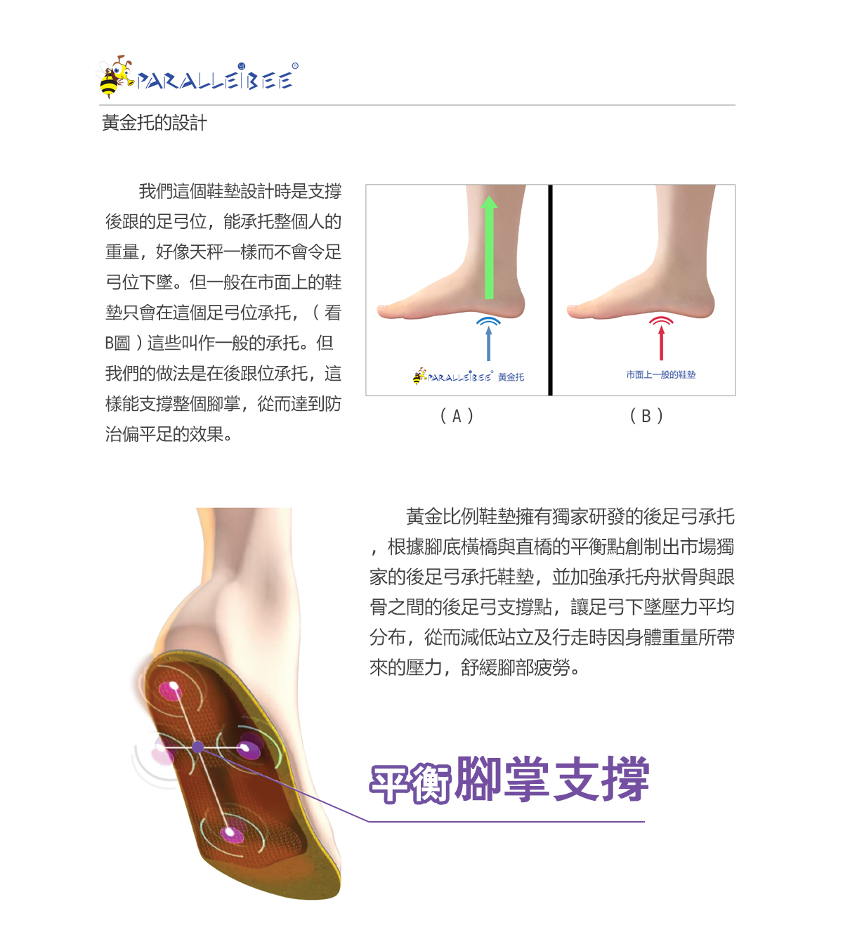 黃金比例鞋墊擁有獨家研發的後足弓承托,跟據腳底橫橋與直橋的平衡點創制出市場獨家的後足弓承托鞋墊,並加強承托舟狀骨與跟骨之間的後足弓支撐點,讓足弓下墜壓力平均分佈,從而減低站立及行走時因身體重量所帶來的壓力,舒緩腳部疲勞。