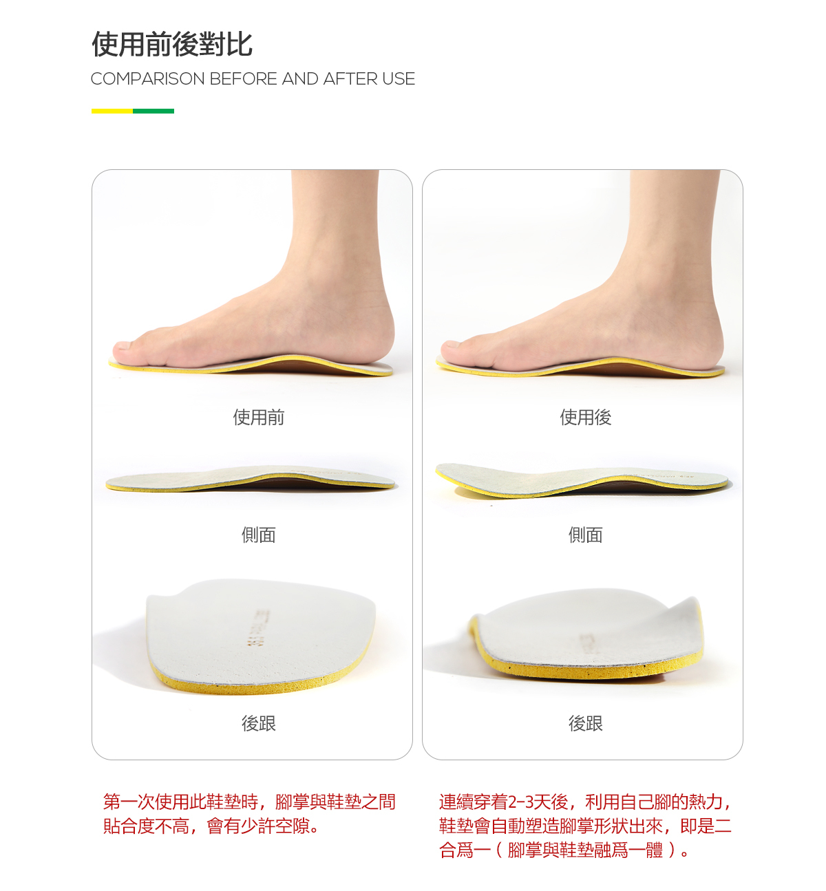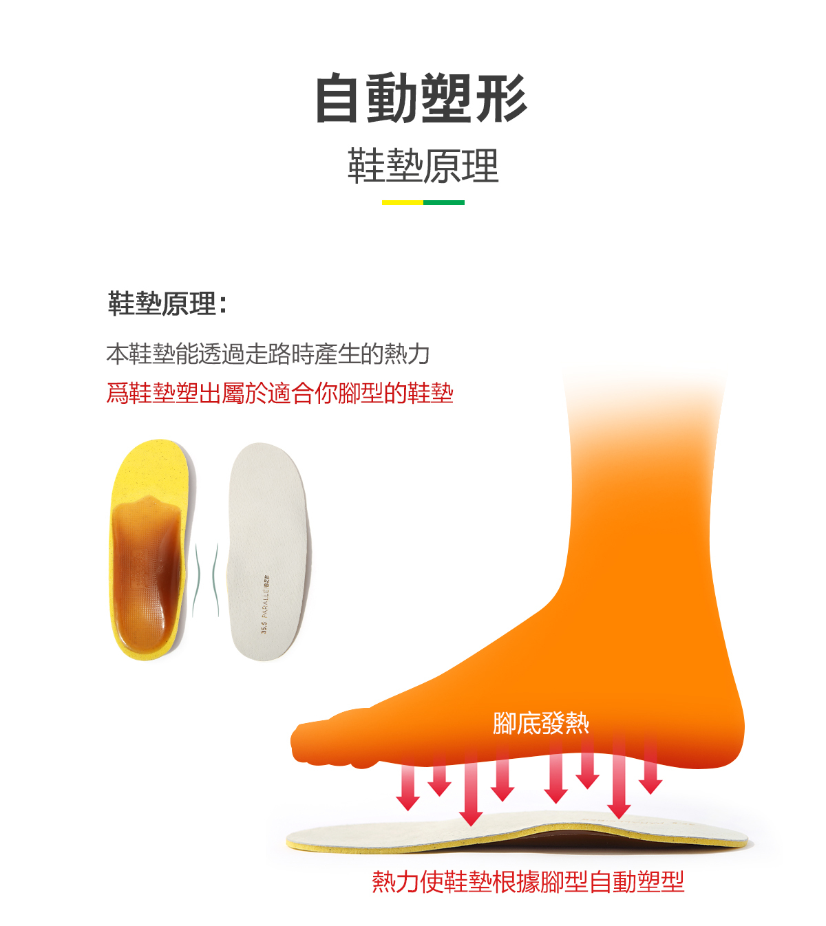 革新設計的黃金比例鞋墊獨有後足弓承托,此設計符合人體力學,比只支撐足弓的普通鞋墊更具承托力和更有效承托身體重量。鞋墊所選物料經過嚴格挑選,能提高回彈力度,讓行走更舒適。同時,更能改善扁平足所引起的問題。